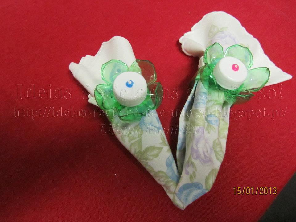 Aqui está uma boa forma de reaproveitar as garrafas de plástico. As argolas de guardanapos cá de casa são todas iguais. Os Filhotes nunca se entendiam sobre qual era o seu guardanapo. Há quem borde/marque os guardanapos eu resolvi marcar a diferença pelas argolas. Usei duas garrafas de água com gás de 0,5 l: * a argola, propriamente dita, foi feita a partir do meio da garrafa; * com o fundo formei a flor - cortei as pétalas e passei ligeiramente sobre uma vela; * o centro branco é a tampa da garrafa; * a distinção está nas missangas (azul e vermelha); * o ponto branco que se vê no meio da missanga é o nó de um pouco de fita de embrulho que serviu para unir todas as peças. Resumindo, aproveitei/reciclei: - a quase totalidade das garrafas, incluindo as tampas; - missangas de um jogo já muito "escangalhado"; - fita de embrulho. O bom de tudo isto é que além de reaproveitar, fica baratinho, é muito útil para nós e é usado diariamente. Só vantagens! ...