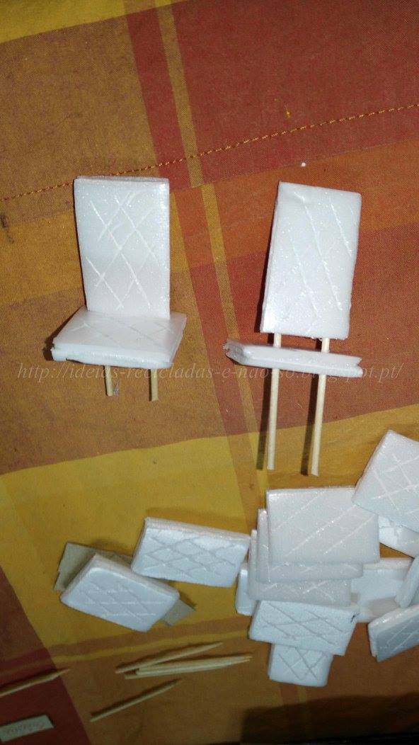- E, finalmente, é só aplicar as pernas às cadeiras, com cola quente. Aqui também é preciso algum cuidado, pois o esferovite deforma/derrete com o calor.