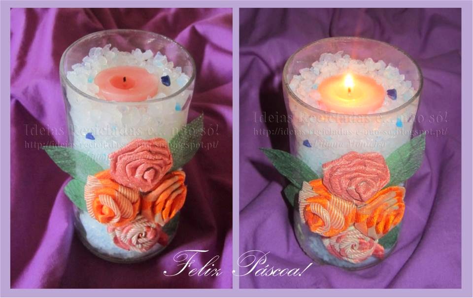 * As flores são em tecido enrolado - Passo a passo em "Rosa Enrolada" e explicações em "Frascos de Vidro Decorados".